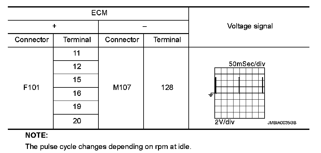 2.Read the voltage signal between ECM harness connector terminals under the following conditions with an oscilloscope.