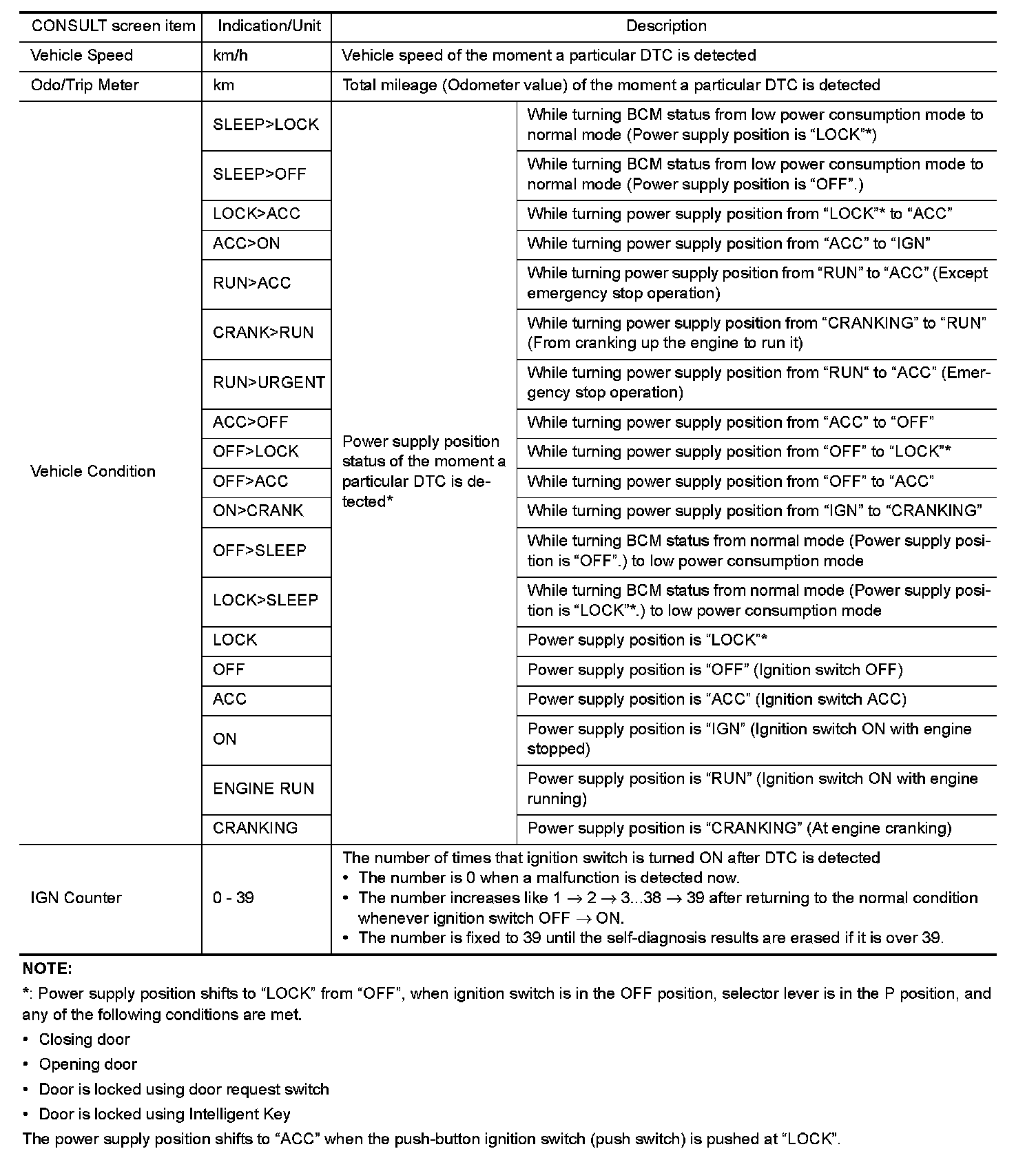 The BCM records the following vehicle condition at the time a particular DTC is detected, and displays on
