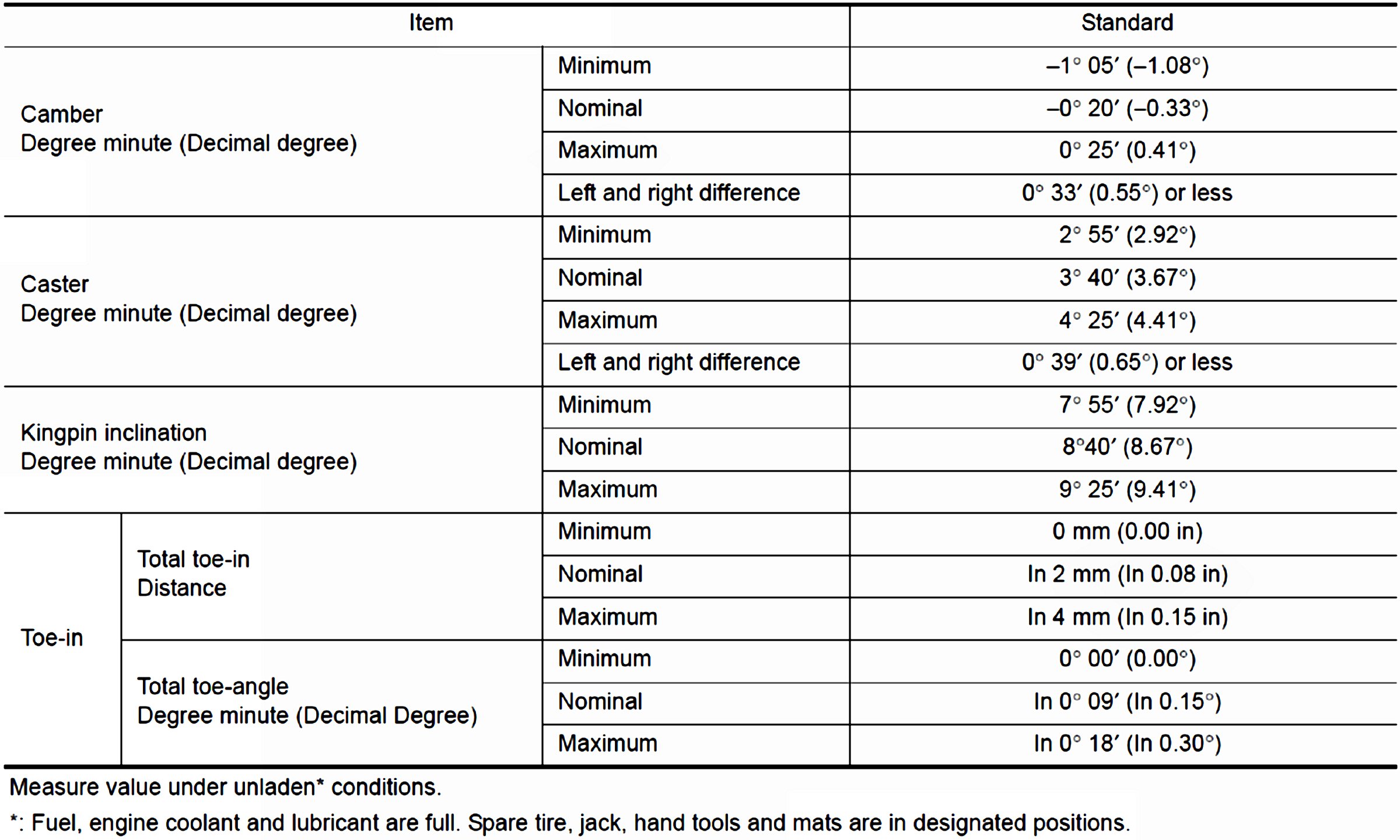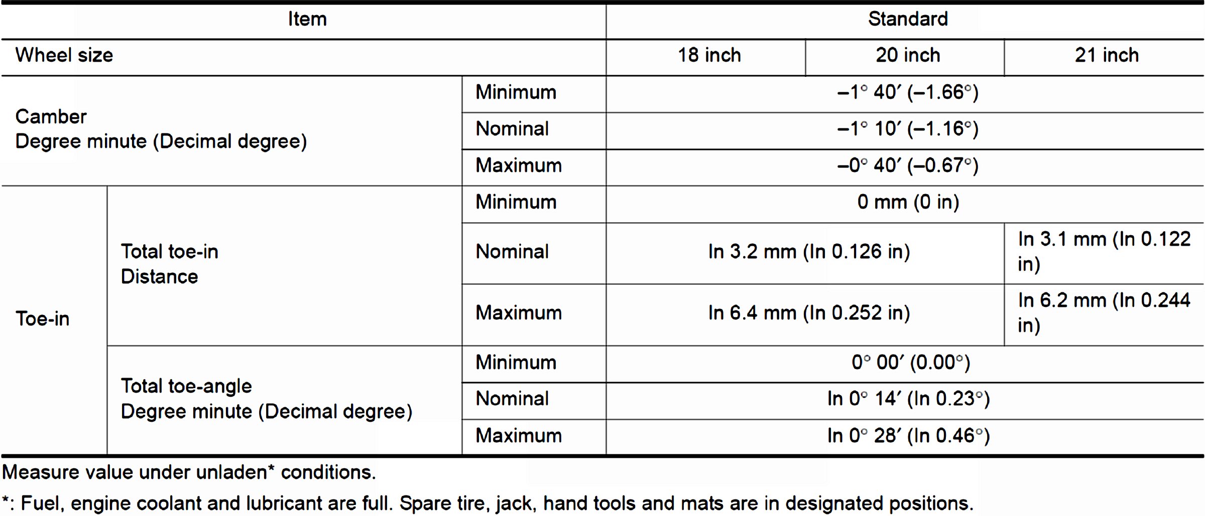 Wheel Alignment Specifications (Unladen)
