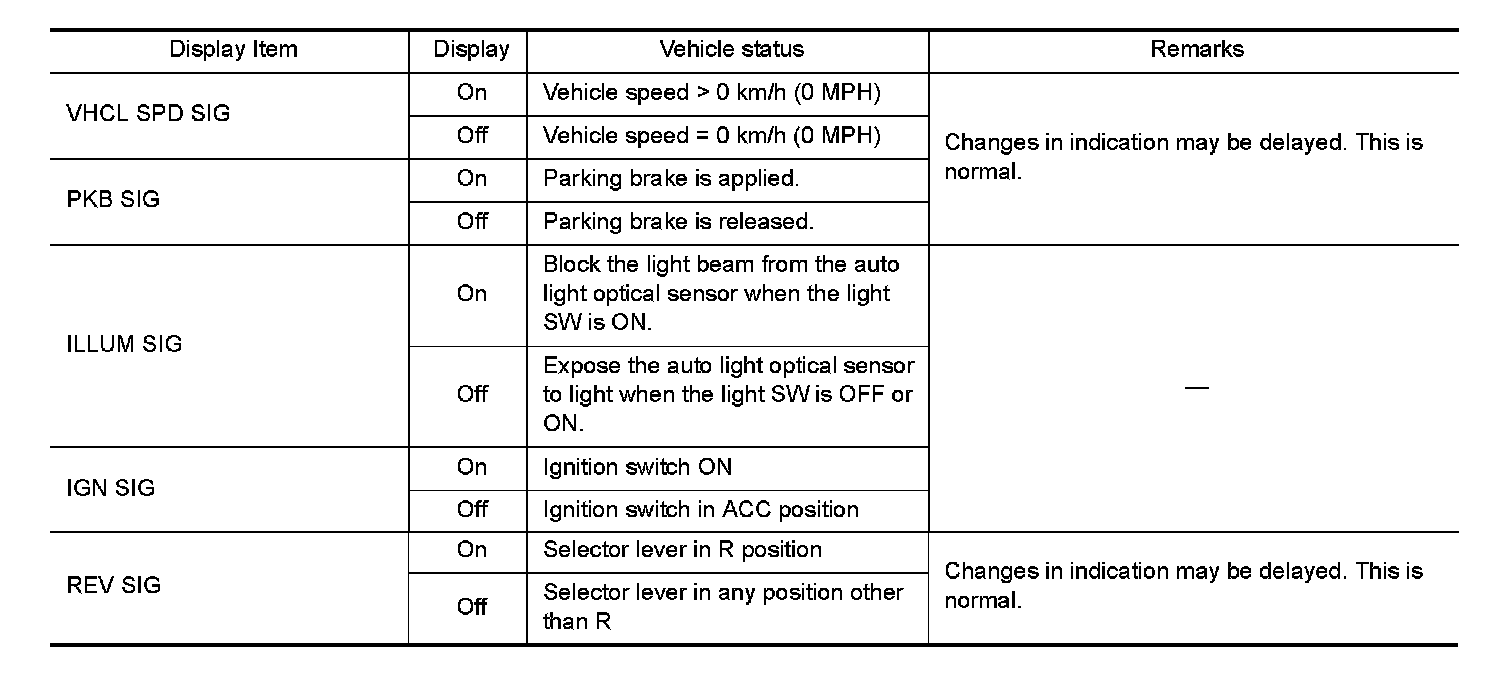 - Displays the status of the following vehicle signals inputted into the AV control unit.