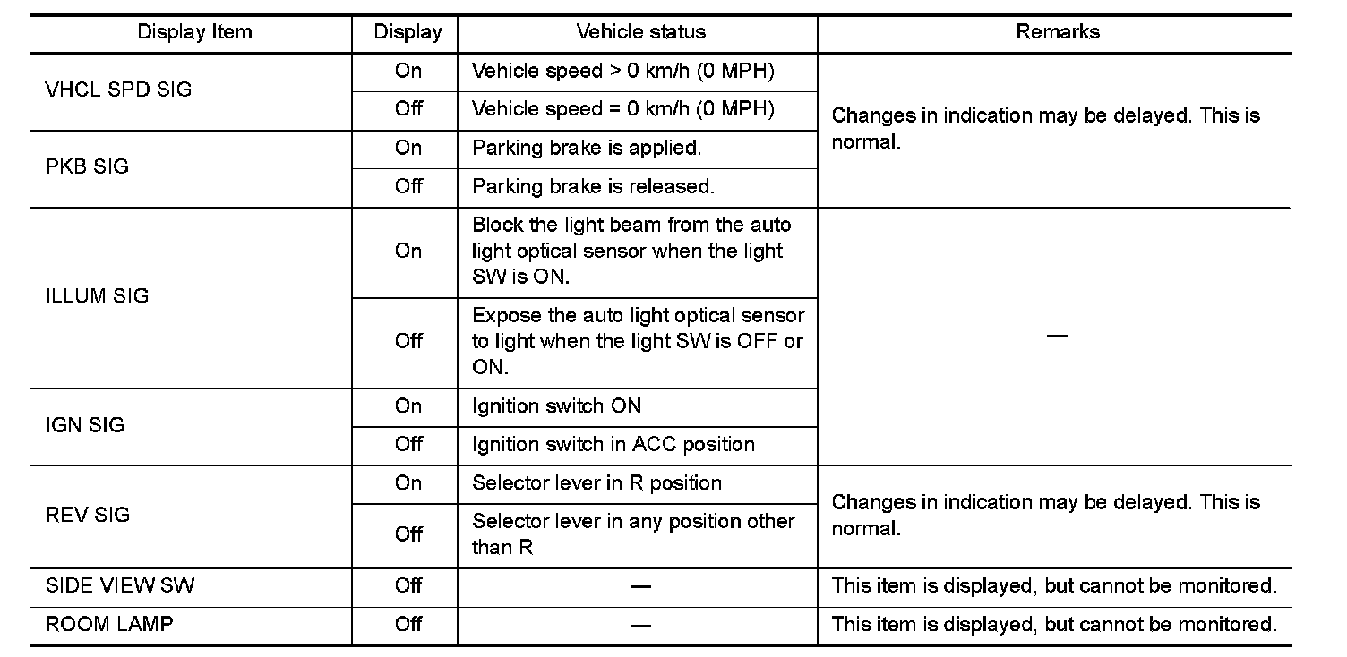 - Displays the status of the following vehicle signals inputted into the AV control unit.
