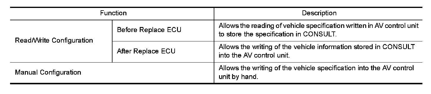 CONSULT performs the following functions via the communication with the AV control unit.