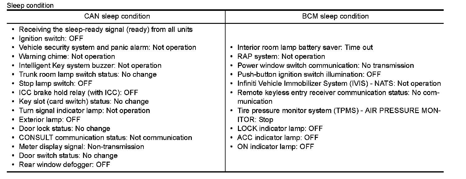 - BCM transmits the sleep wake up signal (sleep) to each unit when all of the CAN sleep conditions are fulfilled.