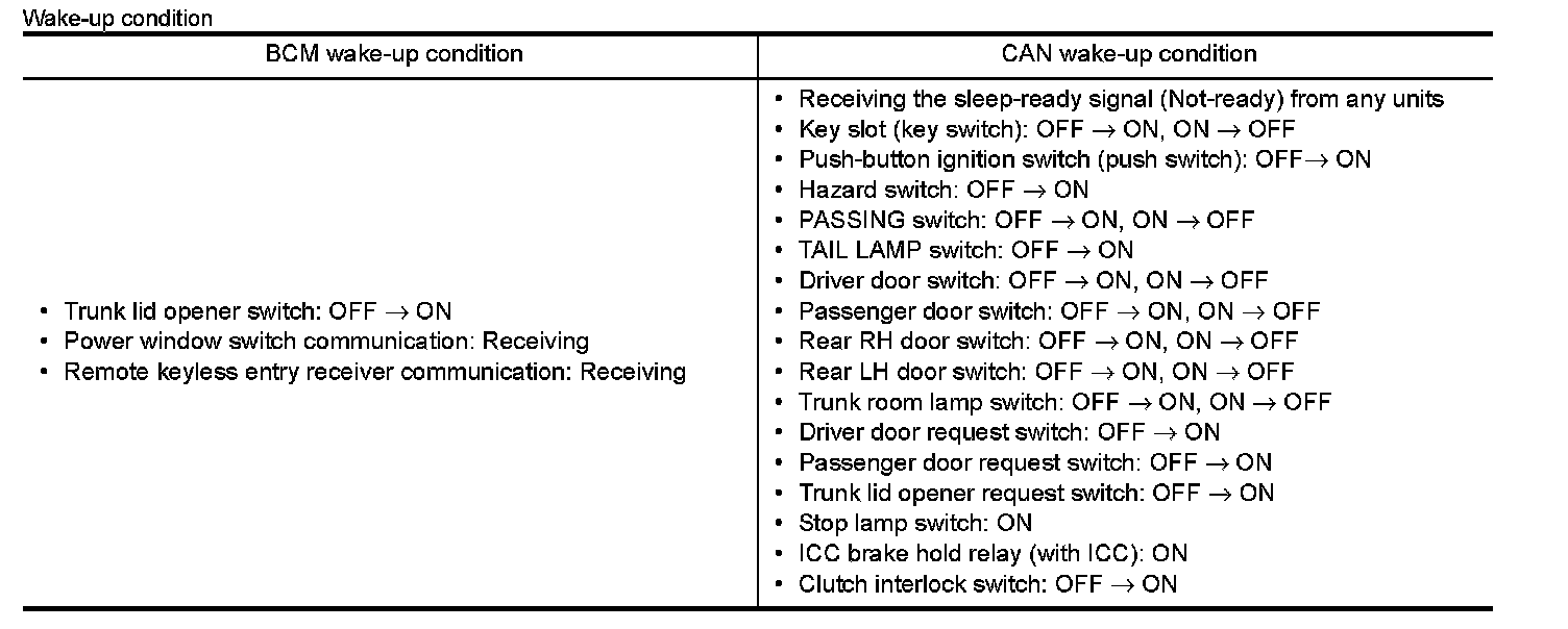 - BCM transmits the sleep wake up signal (wake up) to each unit when any of the CAN wake-up conditions is fulfilled. It changes from the low power consumption mode or the CAN communication sleep mode to the normal mode.