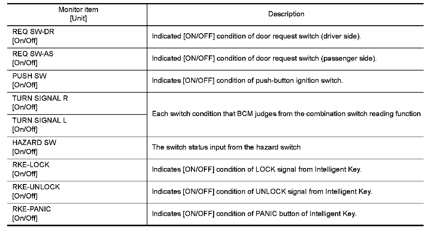 The following table includes information (items) inapplicable to this vehicle. For information (items) applicable to this vehicle, refer to CONSULT display items.