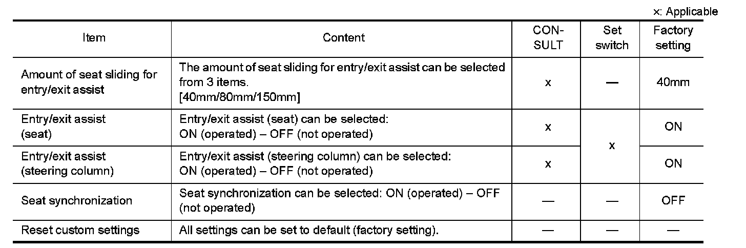 The settings of the automatic driving positioner system can be changed, using CONSULT, and the set switch.