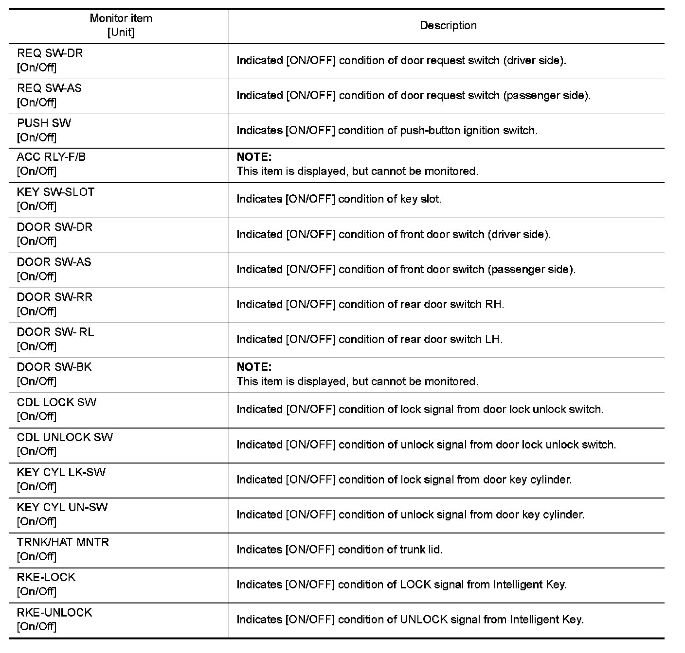 The following table includes information (items) inapplicable to this vehicle. For information (items) applicable to this vehicle, refer to CONSULT display items.