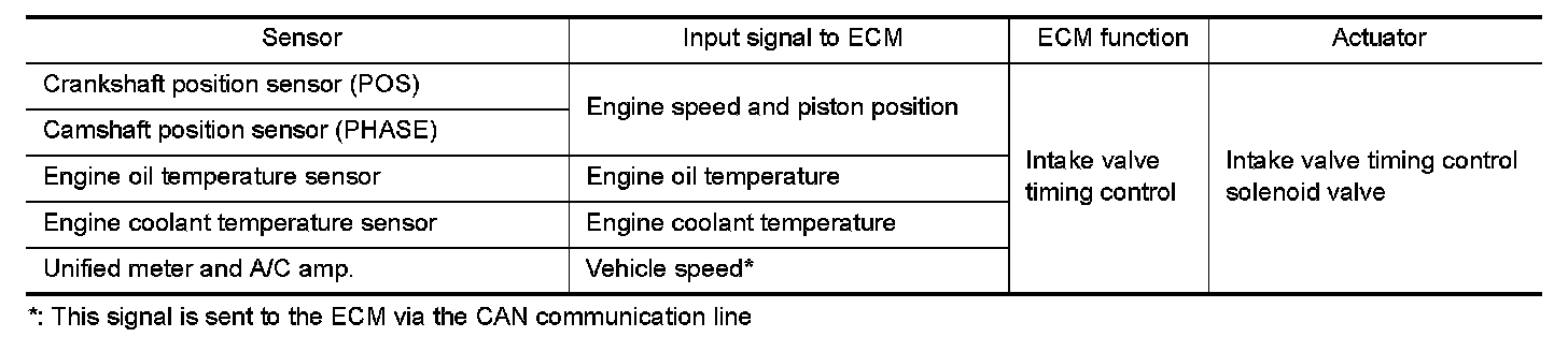The ECM receives signals such as crankshaft position, camshaft position, engine speed, and engine coolant temperature. Then, the ECM sends ON/OFF pulse duty signals to the intake valve timing (IVT) control solenoid valve depending on driving status. This makes it possible to control the shut/open timing of the intake valve to increase engine torque in low/mid speed range and output in high-speed range.