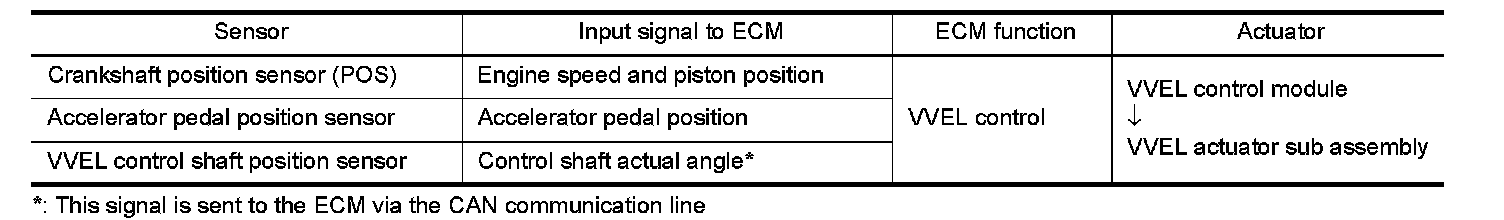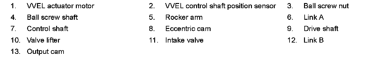 VVEL (Variable Valve Event & Lift) is a system that controls valve event and valve lift continuously. Rotational movement of the drive shaft equipped with eccentric cam is transmitted to output cam via the rocker arm and two kinds of links to depress the intake valve. ECM decides the target valve lift according to the driving condition and sends the command signal to the VVEL control module. The VVEL control module controls the rotation of the control shaft using the VVEL actuator motor and changes the movement of the output cam by shifting the link supporting point. As a result, valve lift changes continuously to improve engine output and response.