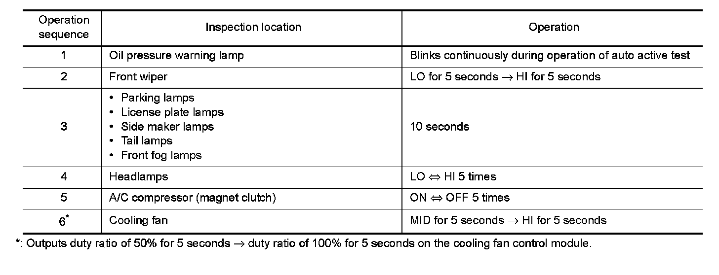 In auto active test mode, the IPDM E/R sends a drive signal to the following systems to check their operation.