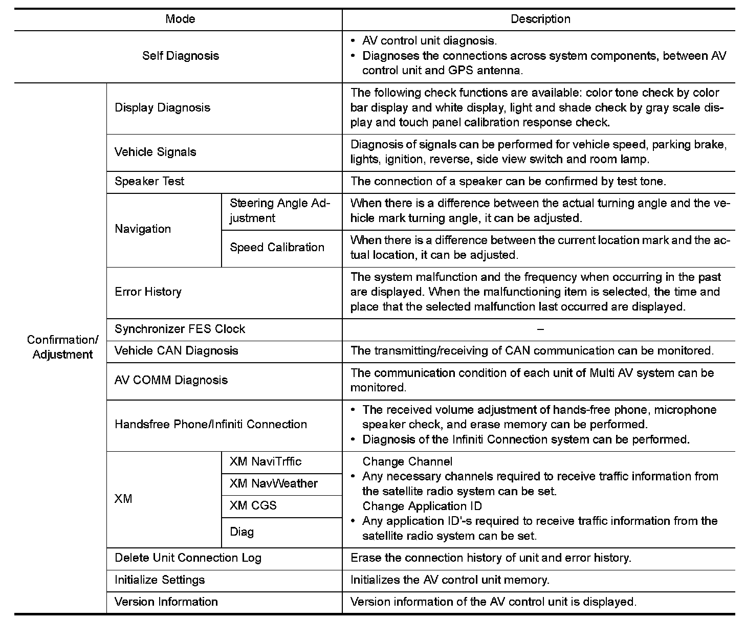 - AV control unit on board diagnosis performs the following functions listed in the table below: