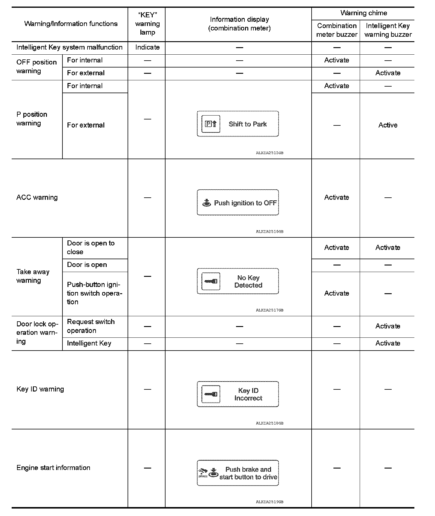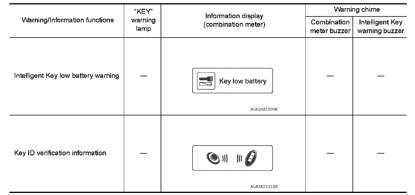 The warning function are as per the following items and are given to the user as warning information and warnings using combinations of Intelligent Key warning buzzer, combination meter buzzer, KEY warning lamp and information display in combination meter.