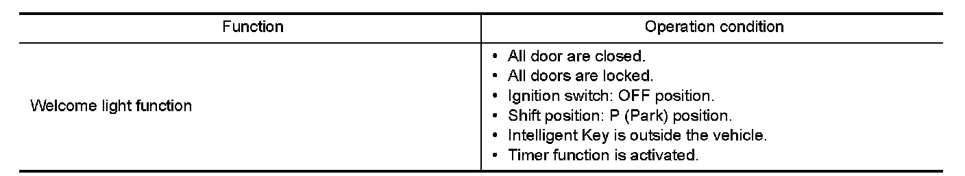 The welcome light function operates as per the following. When the Intelligent Key is within the outside key