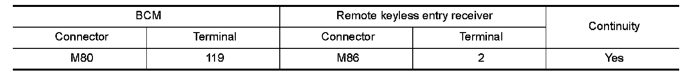 2.Check continuity between BCM harness connector and remote keyless entry receiver harness connector.
