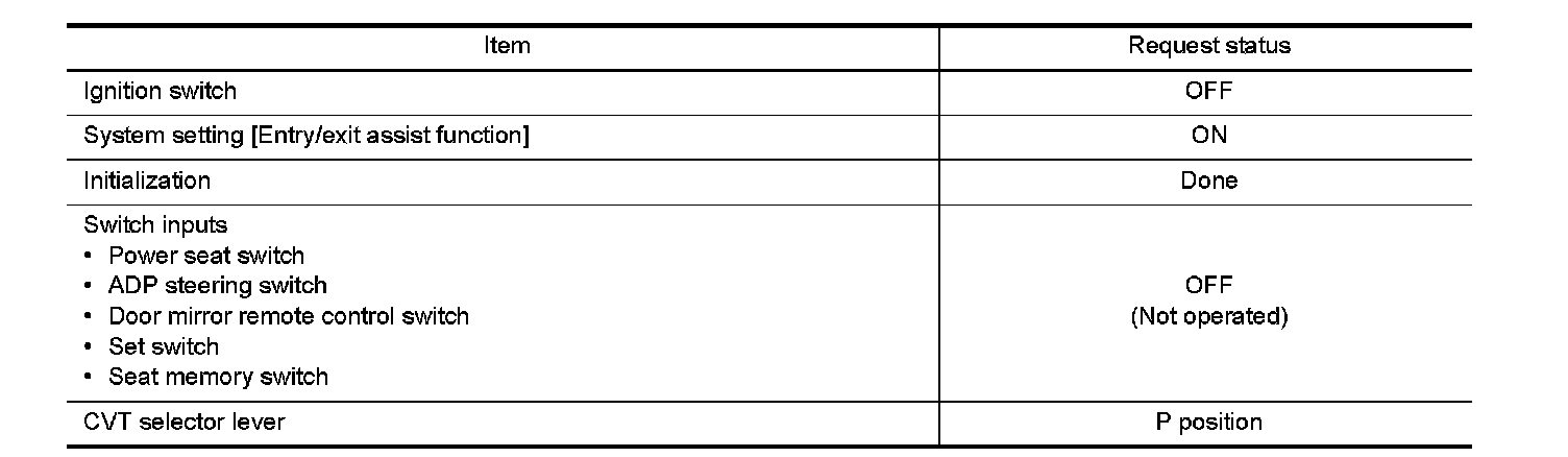 Satisfy all of the following items. The exit assist function is not performed if these items are not satisfied.