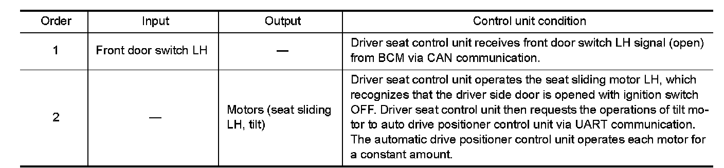 When exiting, if the conditions are satisfied, the seat is moved backward from normal sitting position and the steering column is moved up.