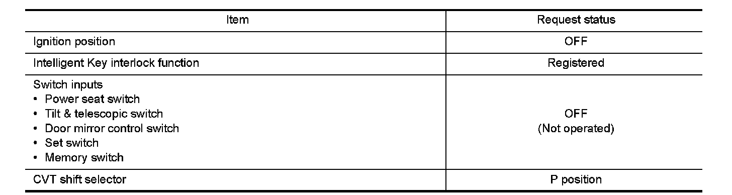 - In standby status, when ignition switch is operated from OFF to ACC, return operation sets seat sliding and steering column tilt to a registered position.