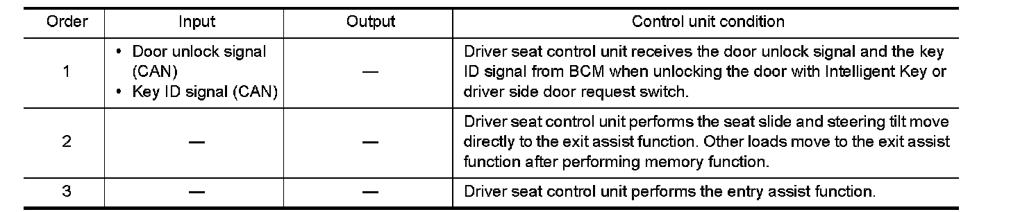 2.Operation other than memory function of seat sliding is performed. Seat sliding and steering column tilt perform exit assist operation.