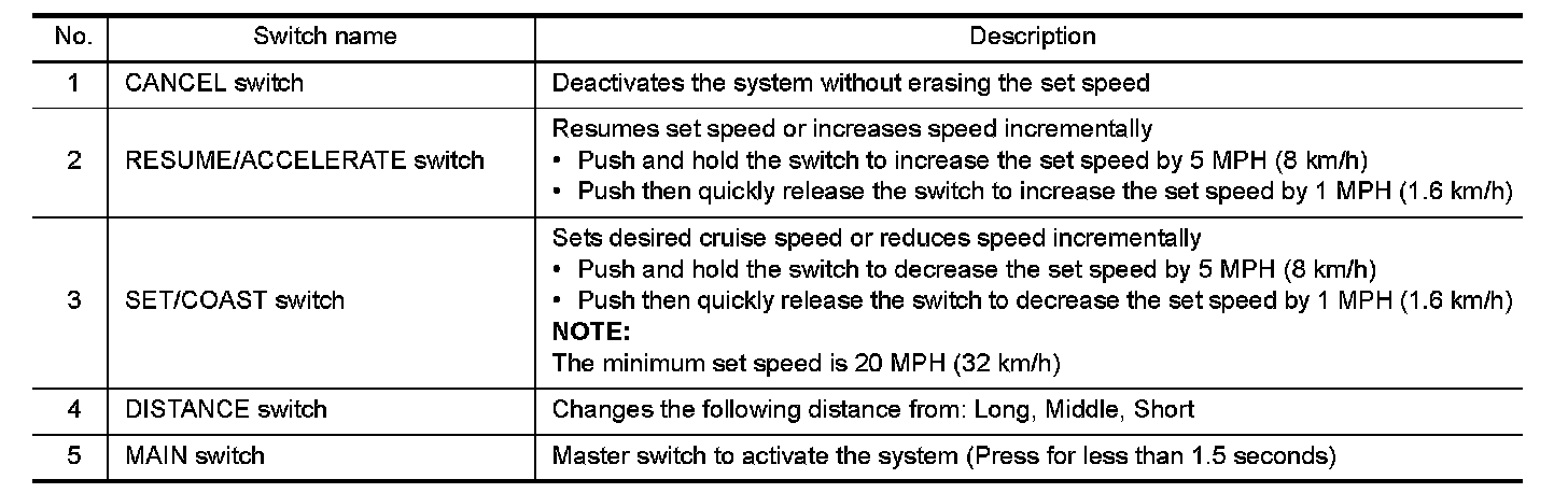 VEHICLE-TO-VEHICLE DISTANCE CONTROL MODE FUNCTION : Switch Name and Function