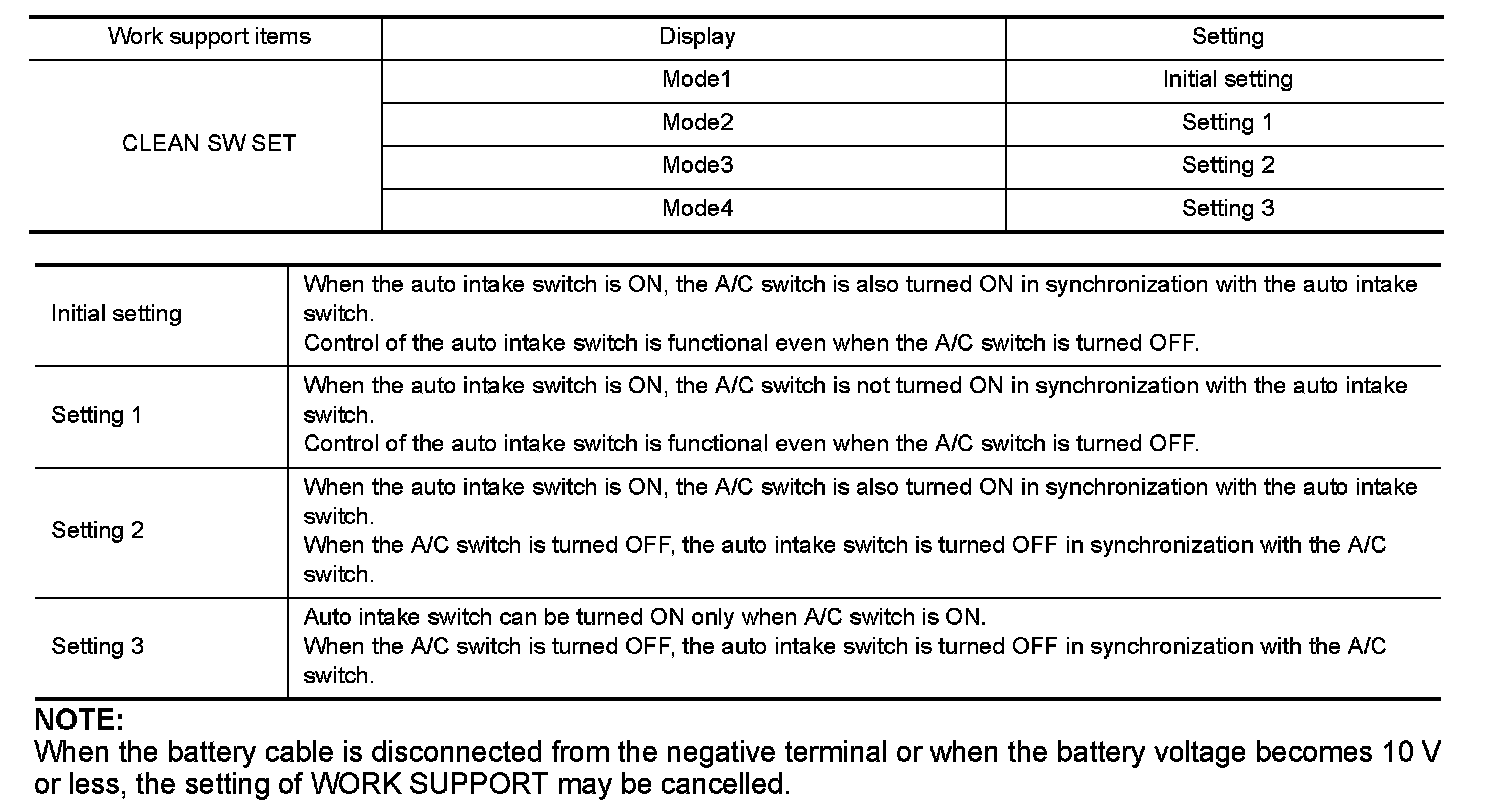 Condition for interlocking movement of auto intake switch and A/C switch can be changed. In addition operation of the auto intake switch, which activates the automatic intake control (exhaust gas / outside odor detecting mechanism), can be set to become available when the A/C switch is ON.