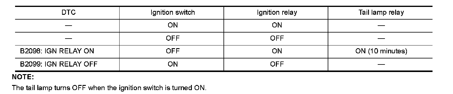 - If the ignition relay cannot turn OFF due to contact seizure, it activates the tail lamp relay for 10 minutes to alert the user to the ignition relay malfunction when the ignition switch is turned OFF.