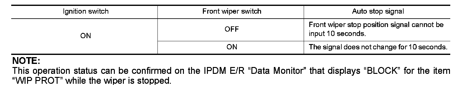 When a front wiper auto stop signal is in the conditions listed below, IPDM E/R stops power supply to wiper after repeating a front wiper 10 second activation and 20 second stop five times.