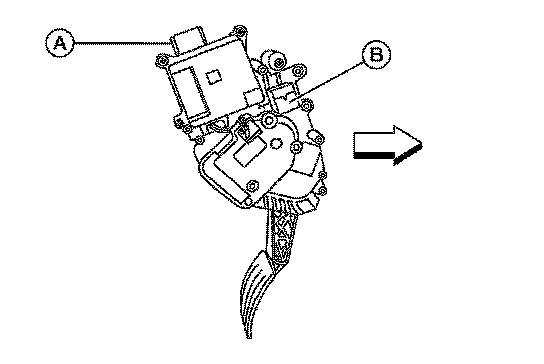 2.Disconnect the two harness connectors (A, B) from the accelerator pedal assembly.