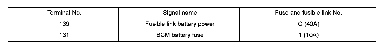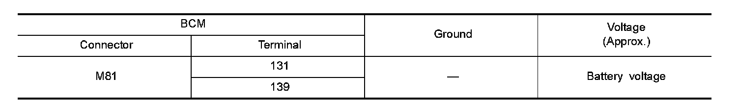 2.Check voltage between BCM connector M81 terminals 131, 139 and ground.