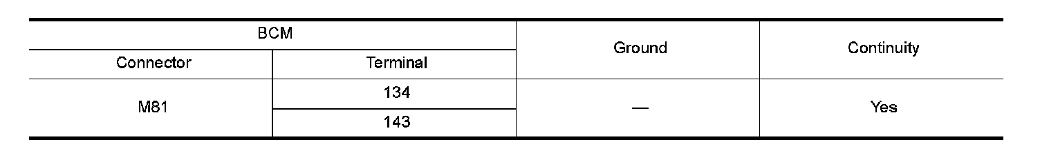 Check continuity between BCM connector M81 terminals 134, 143 and ground.