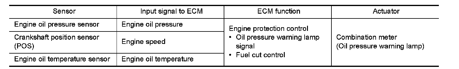 The combination meter turns ON the oil pressure warning lamp, according to the signals. When detecting a decrease in engine oil pressure, ECM cuts fuel if the engine speed exceeds the specified value.