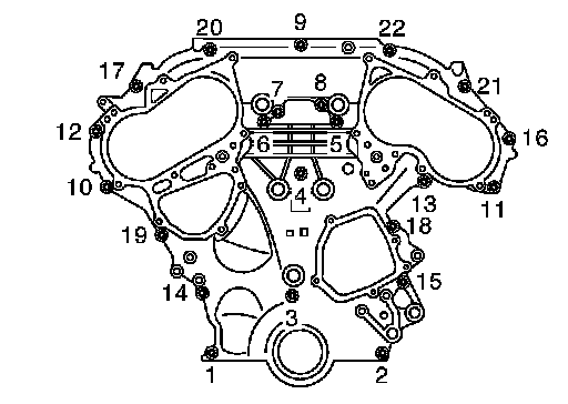 Tighten the front timing chain case bolts in the order shown.
