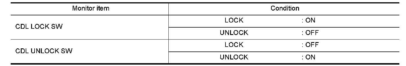 Check ("CDL LOCK SW ", "CDL UNLOCK SW") in "DATA MONITOR" mode for "POWER DOOR LOCK SYSTEM" with CONSULT. Refer to "DOOR LOCK : CONSULT Function (BCM DOOR LOCK)" Door Lock.