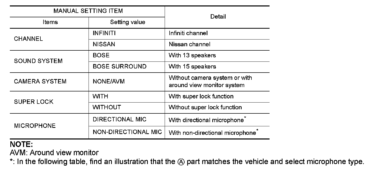 Select "Manual Configuration", and write the setting value as shown in the following table to AV control unit according to the vehicle specification.