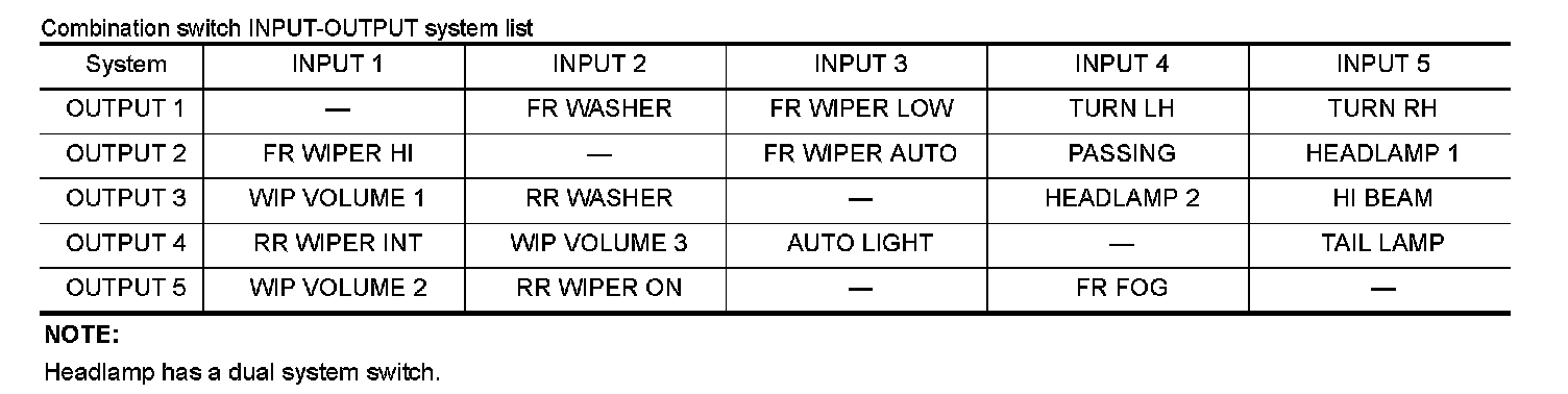 - BCM detects the combination switch status signal "5AD" when the signals of OUTPUT 1 and OUTPUT 4 are input to INPUT 5.