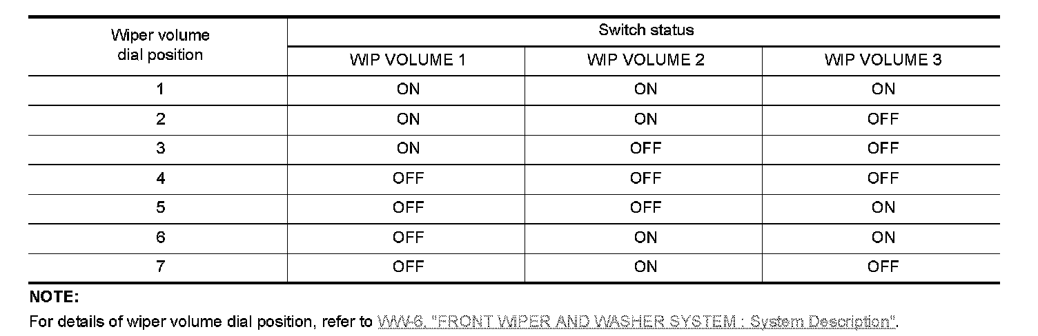 BCM judges the wiper volume dial 1 - 7 by the status of WIP VOLUME 1, 2 and 3 switches.
