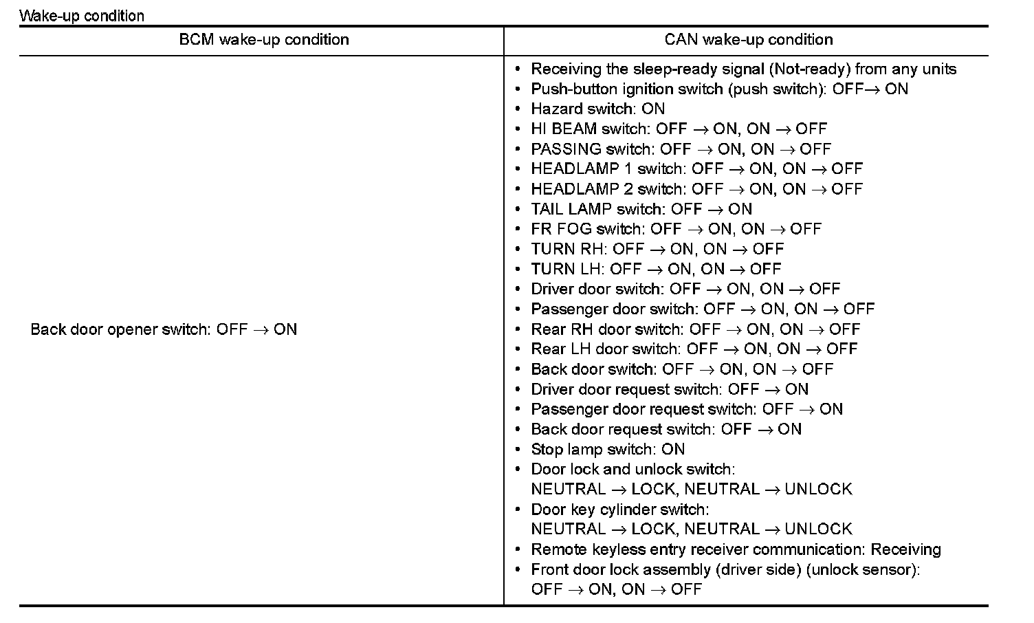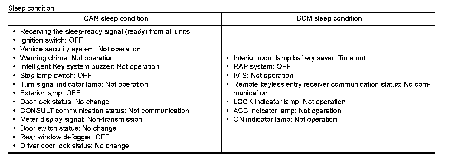 - BCM transmits the sleep wake up signal (sleep) to each unit when all of the CAN sleep conditions are fulfilled.