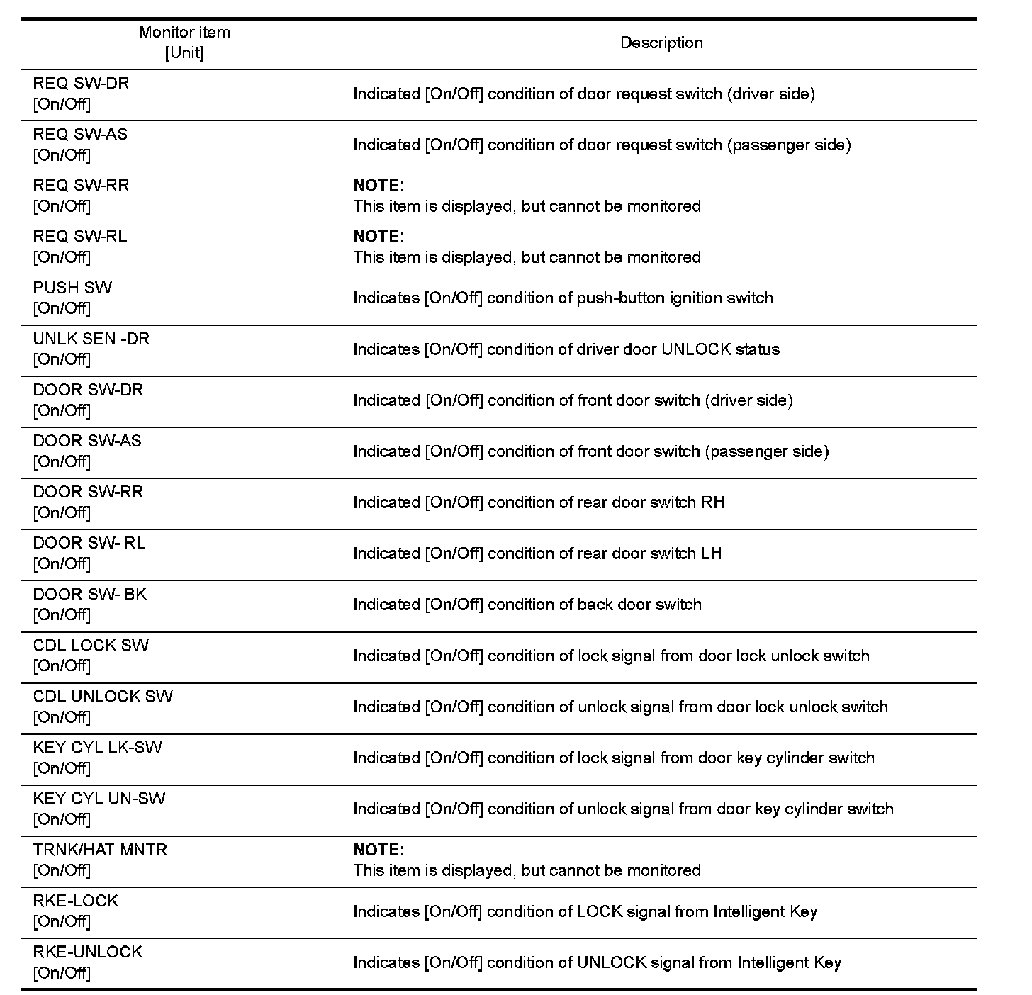 The following table includes information (items) inapplicable to this vehicle. For information (items) applicable to this vehicle, refer to CONSULT display items.