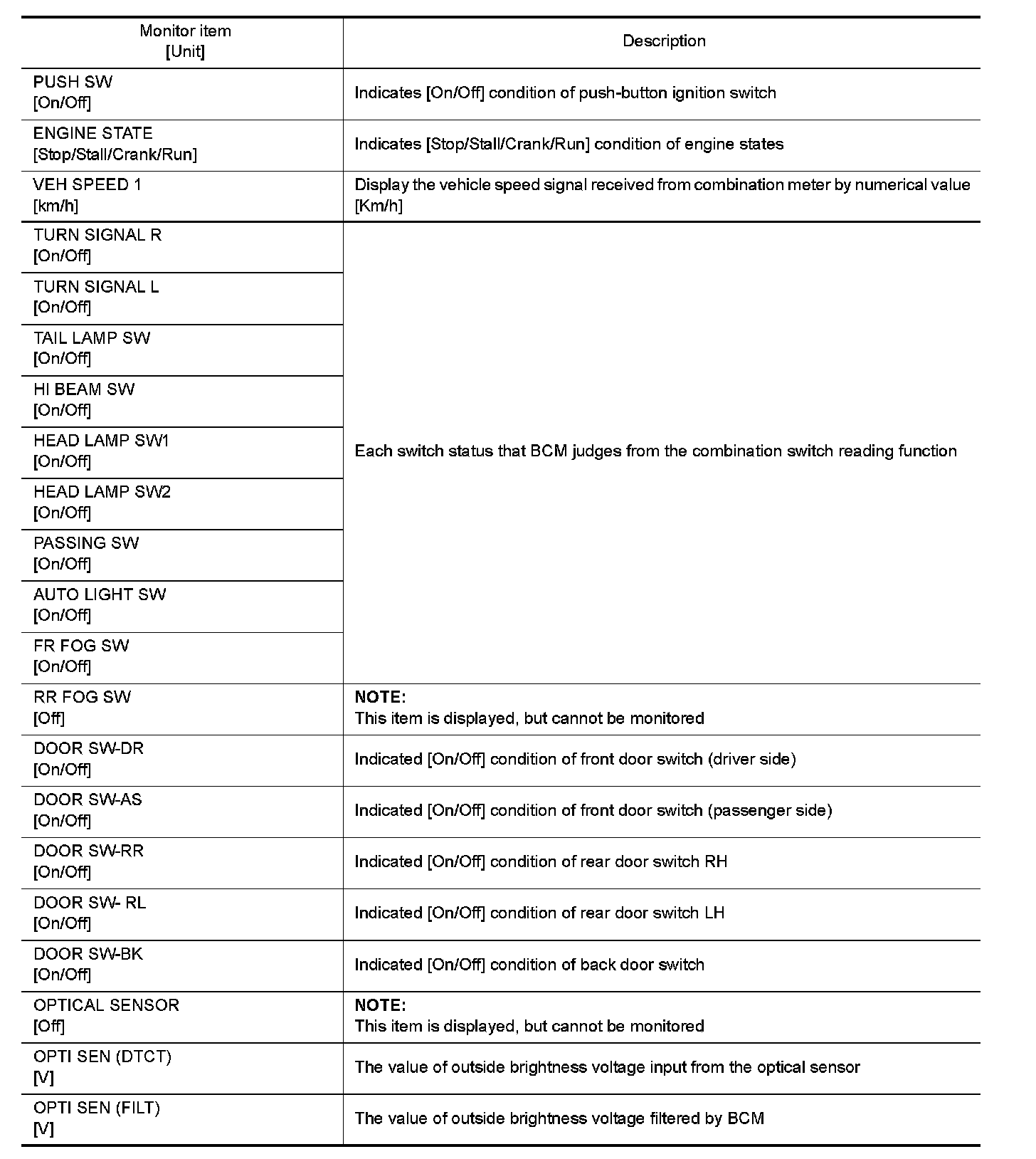 The following table includes information (items) inapplicable to this vehicle. For information (items) applicable to this vehicle, refer to CONSULT display items.
