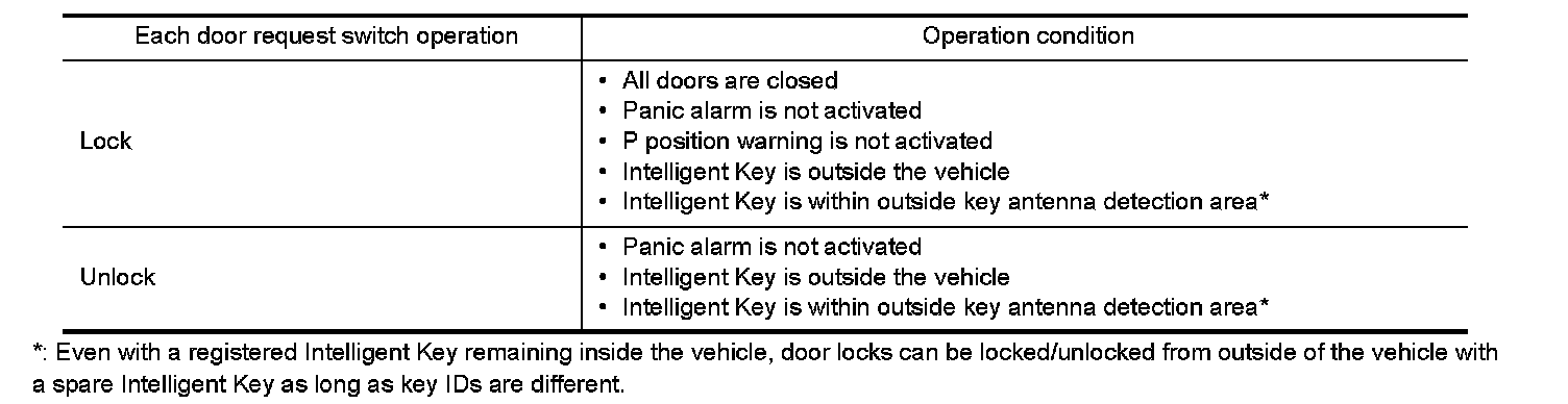 If the following conditions are satisfied, door lock/unlock operation is performed if the door request switch is operated.