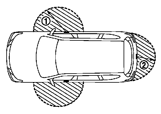 The outside key antenna detection area of door lock/unlock function is in the range of approximately 80 cm (31.50 in) surrounding the driver, passenger door handles (1) and back door handle (2). However, this operating range depends on the ambient conditions.