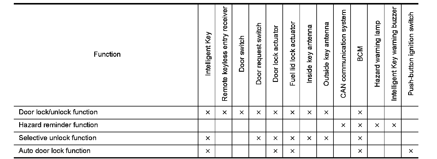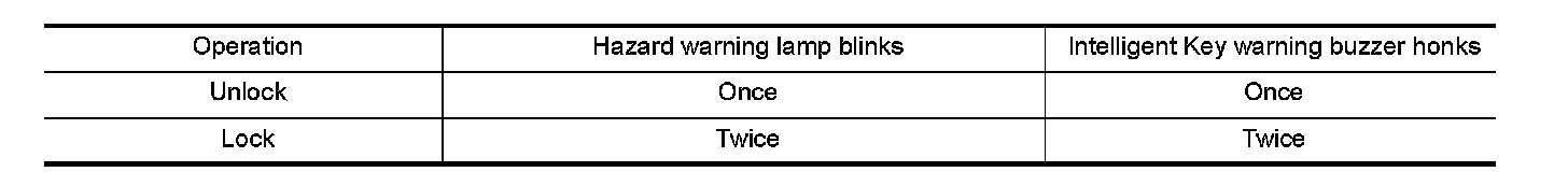 - BCM sounds Intelligent Key warning buzzer (lock: 2 times, unlock: 1 time) and blinks hazard warning lamps (lock: 2 times, unlock: 1 time) at the same time as a reminder.