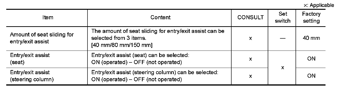 The settings of the automatic driving positioner system can be changed, using CONSULT, the display unit in the center of the instrument panel and the set switch. Always check the settings before and after disconnecting the battery terminal or replacing driver seat control unit.