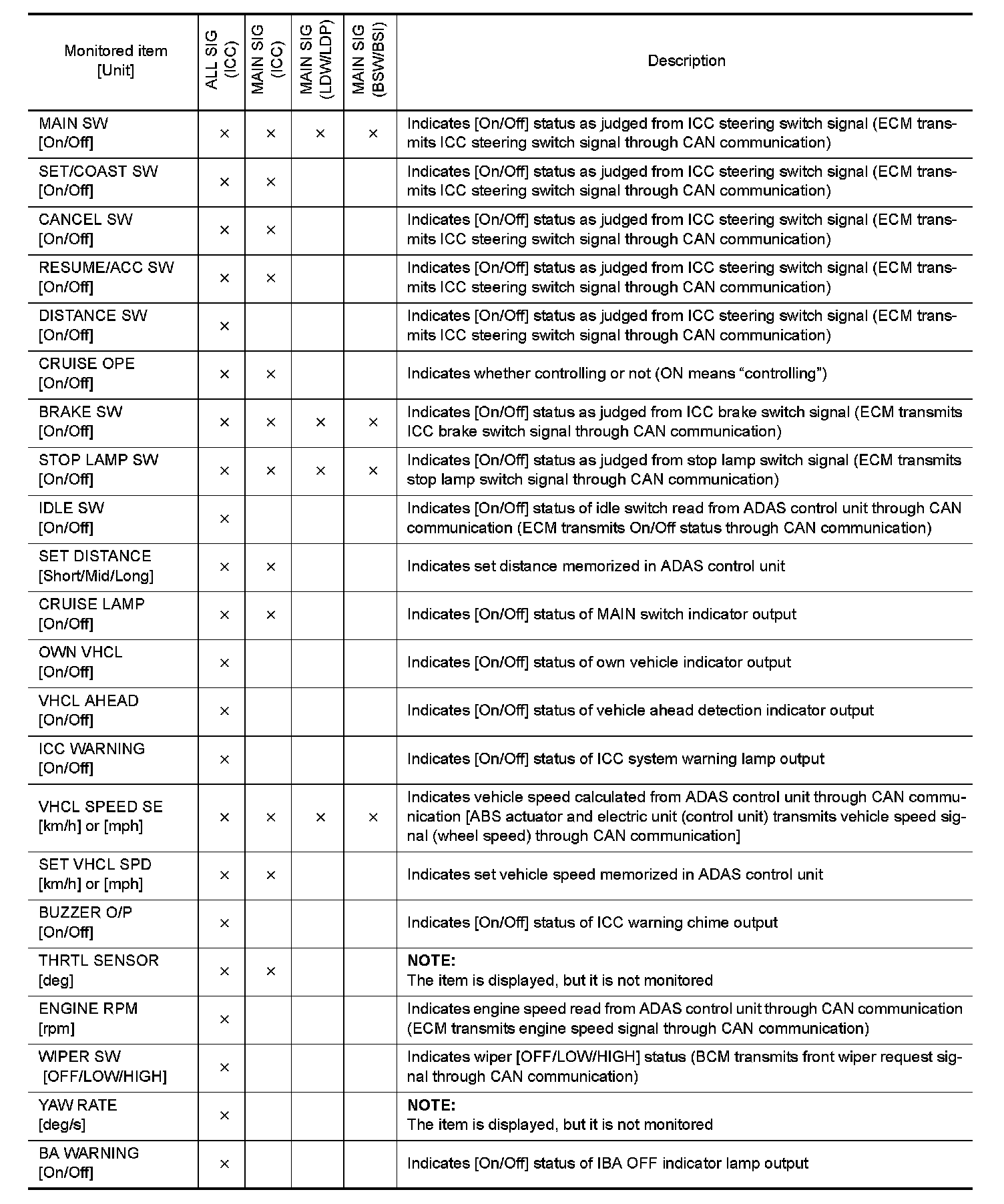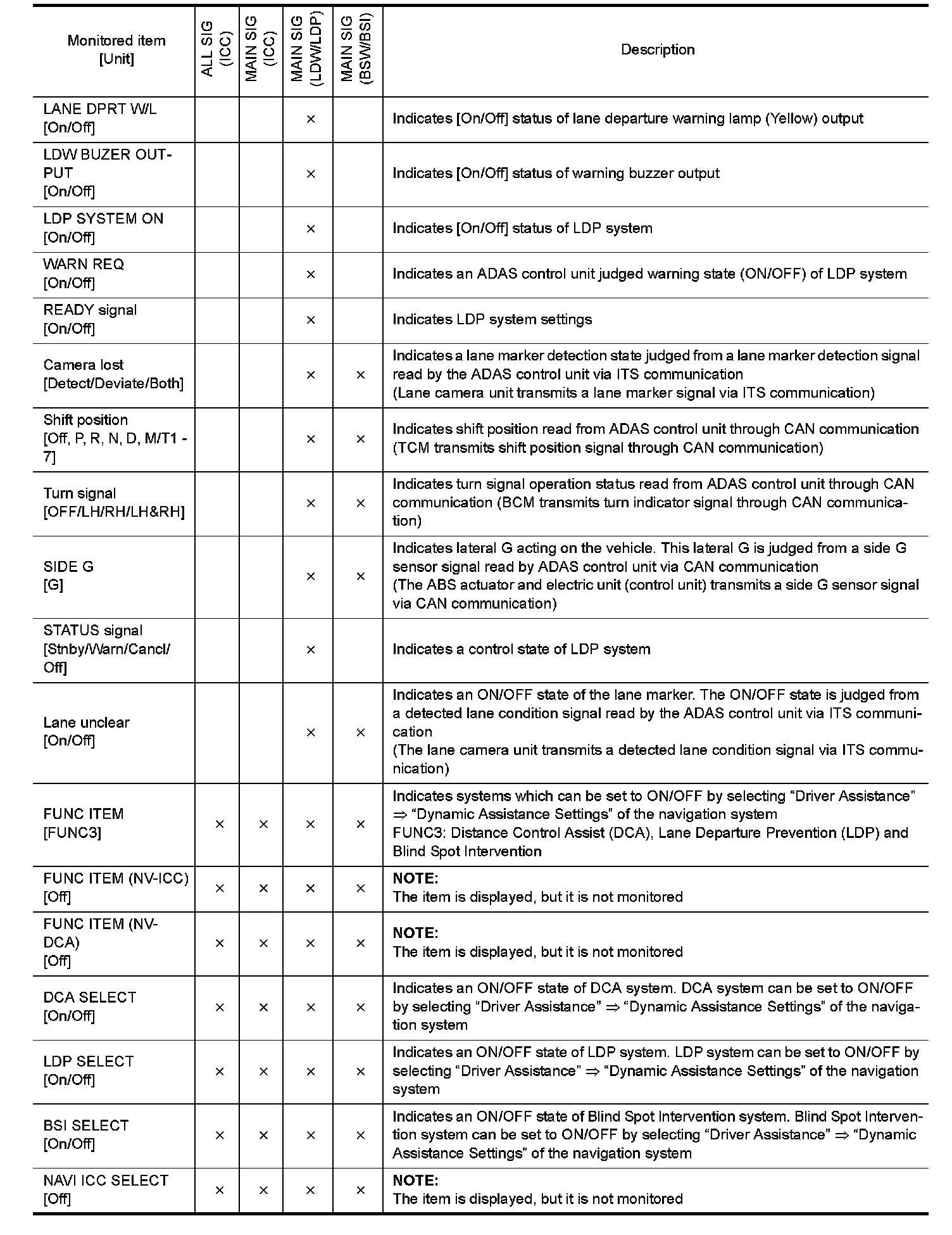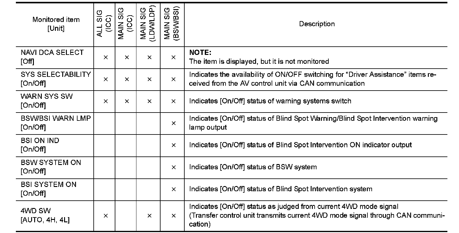 The following table includes information (items) inapplicable to this vehicle. For information (items) applicable to this vehicle, refer to CONSULT display items.