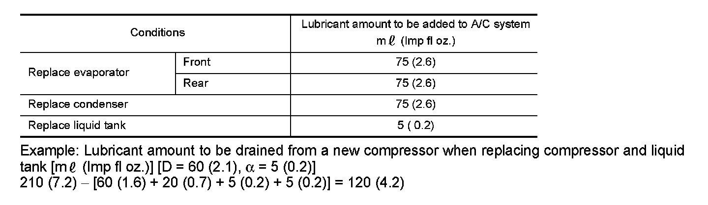 If lubricant amount that is drained from removed compressor is less than 60 m (2.1 Imp fl oz.), perform calculation by setting "D" as 40 m (1.4 Imp fl oz.).