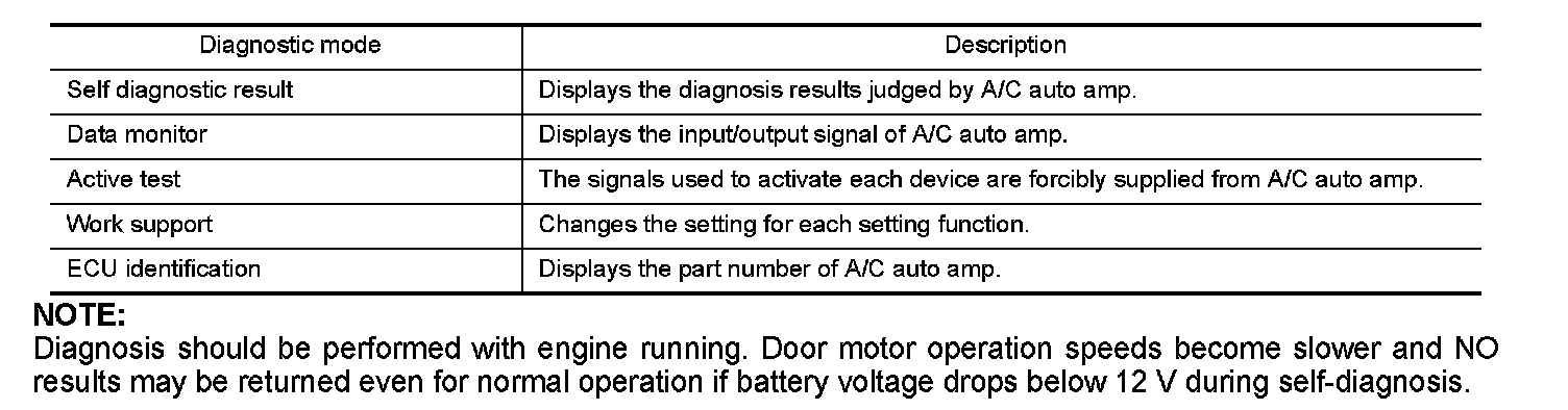 Diagnosis should be performed with engine running. Door motor operation speeds become slower and NO