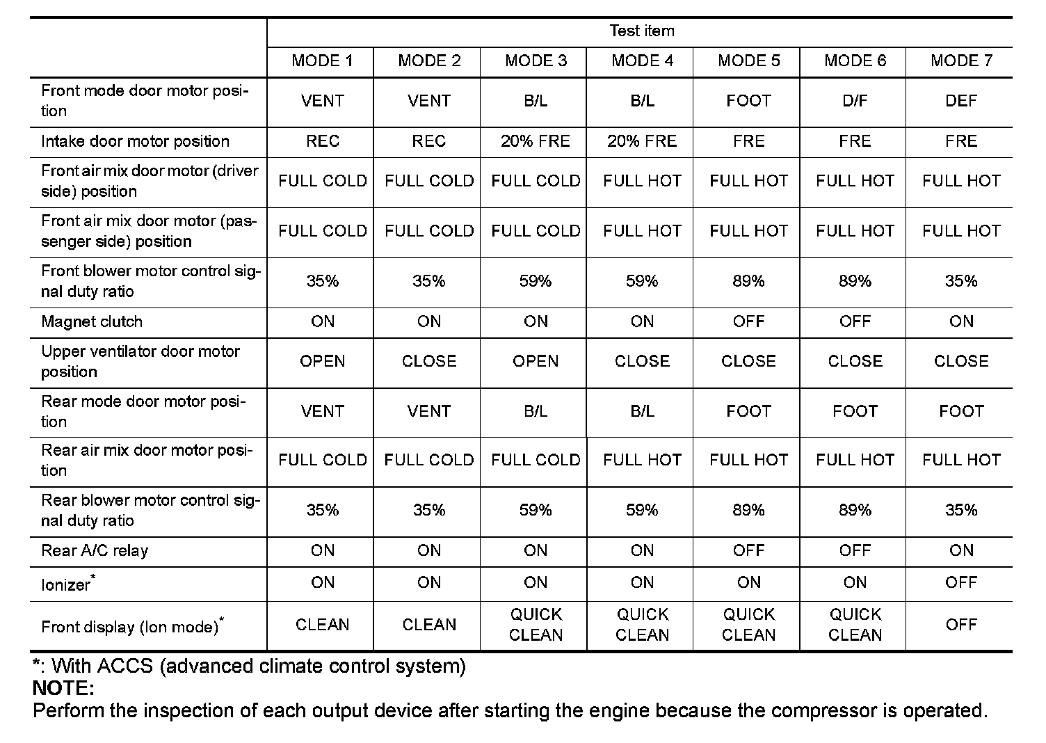 Perform the inspection of each output device after starting the engine because the compressor is operated.