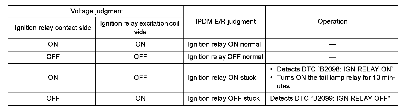 - IPDM E/R judges the ignition relay error if the voltage differs between the contact circuit and the excitation coil circuit.