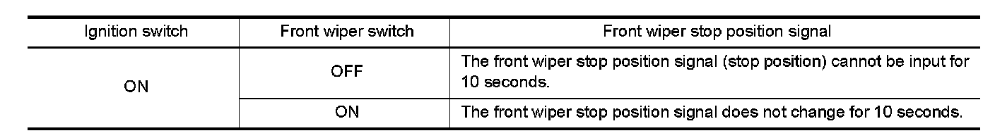 When a front wiper stop position signal is in the conditions listed below, IPDM E/R stops power supply to wiper after repeating a front wiper 10 seconds activation and 20 seconds stop.