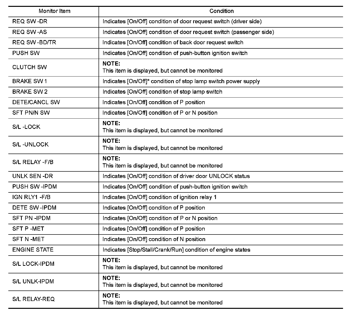 The following table includes information (items) inapplicable to this vehicle. For information (items) applicable to this vehicle, refer to CONSULT display items.