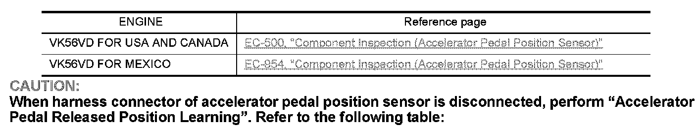 - For the electrical inspection of accelerator pedal position sensor, refer to the following table:
